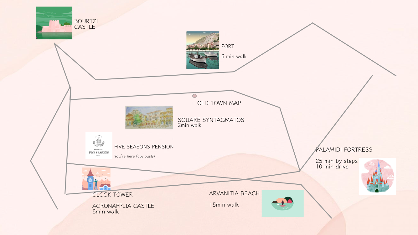The aim of Five Seasons pension is to provide the best accomodation in a serene and warm atmosphere making your holidays in Nafplio unique and delightful. All rooms are decorated with love and the personal taste of the owners ,inspired from the glorious days of the old Nafplio .The basic facilities of a room such as air condition, mini refrigerator and television in a dreamy and peaceful ambience. The bathrooms are comfortable, clean and spacious. The guest rooms have beautiful furniture and colours.